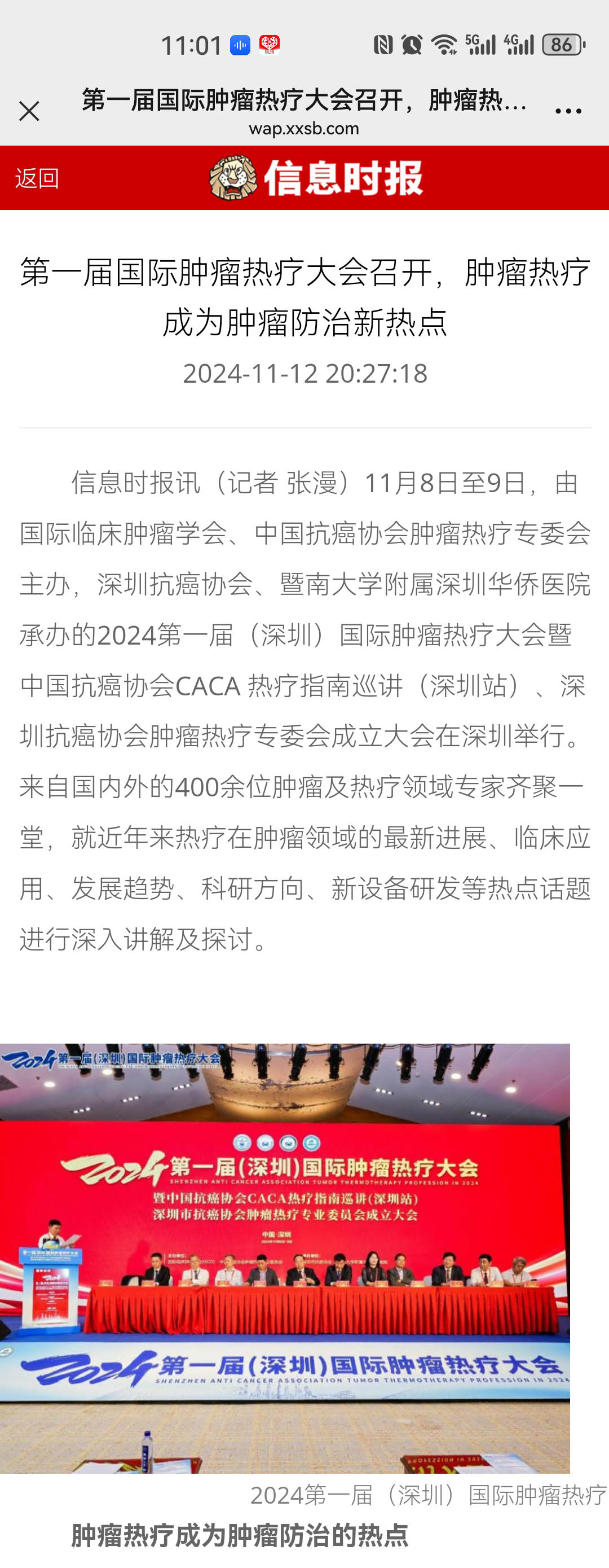 信息时报讯(记者 张漫)11月8日至9日,由国际临床肿瘤学会、中国抗癌协会肿瘤热疗专委会主办,深圳抗癌协会、暨南大学附属深圳华侨医院承办的2024第一届(深圳)国际肿瘤热疗大会暨中国抗癌协会CACA 热疗指南巡讲(深圳站)、深圳抗癌协会肿瘤热疗专委会成立大会在深圳举行。来自国内外的400余位肿瘤及热疗领域专家齐聚一堂,就近年来热疗在肿瘤领域的最新进展、临床应用、发展趋势、科研方向、新设备研发等热点话题进行深入讲解及探讨。