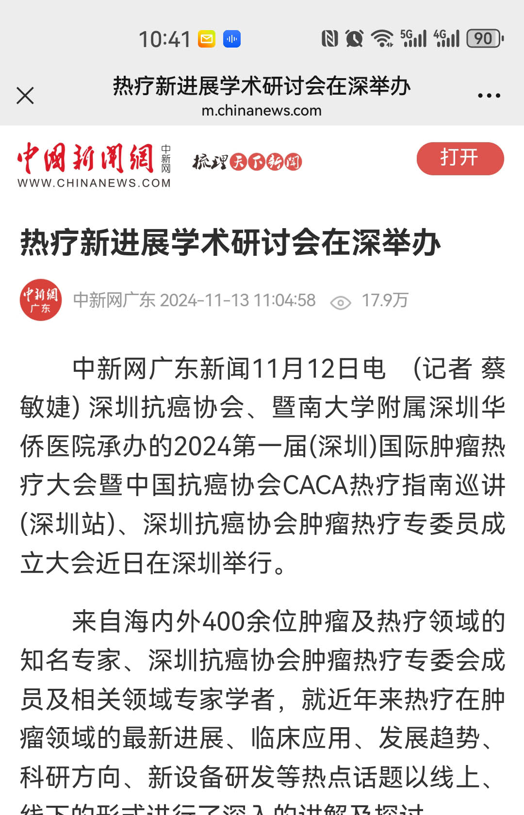 中新网广东新闻11月12日电 (记者 蔡敏婕) 深圳抗癌协会、暨南大学附属深圳华侨医院承办的2024第一届(深圳)国际肿瘤热疗大会暨中国抗癌协会CACA热疗指南巡讲(深圳站)、深圳抗癌协会肿瘤热疗专委员成立大会近日在深圳举行。