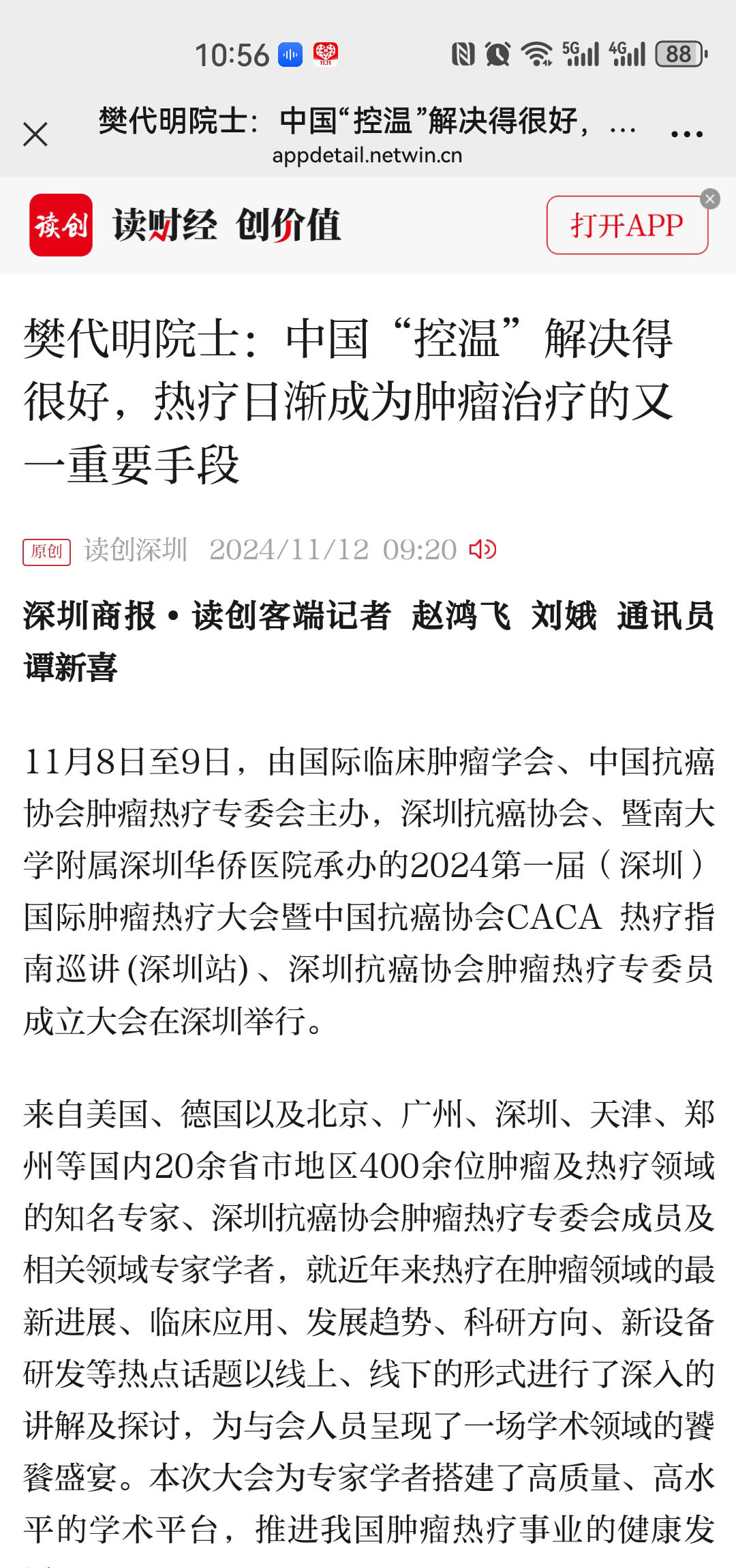 中国抗癌协会理事长、中国工程院樊代明院士介绍:“热疗是用物理学治疗肿瘤的方法之一,人体在47度是可以耐受的,但肿瘤在43度就必死无疑,利用这个热度差,可以进行治疗,在消灭肿瘤的同时,人体不会受到很大的损伤。过去,温度控制一直是难点, 解决不好。现在,中国的控温技术解决得很好!”樊代明院士说:“物理治疗肿瘤的方法很多,不单单是热疗,还包括冷疗,也包括射线、放疗、质子治疗等,肿瘤的物理治疗方法在未来将为患者带来更多福音。所以,我希望大家认真去研究、深刻的探讨,不仅医生们要在一起‘攻关’,还要携手物理学专家跟我们一起来开展相关工作,多学科整合治疗,才能达到更好的治疗效果。”
